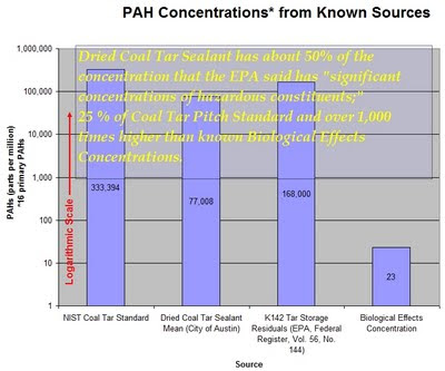 So let’s do a comparison. How about comparing a national standard for unrefined coal tar, and EPA-researched levels of PAHs in byproducts of coking coal production to the average PAH concentration in a series of dried coal tar sealant products?