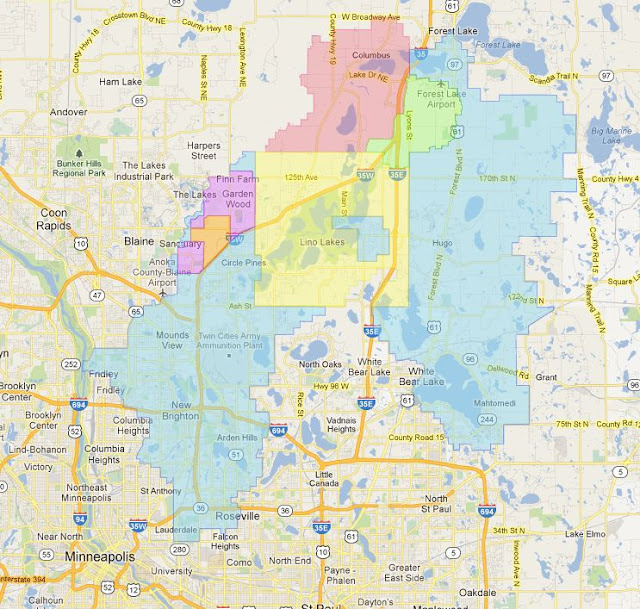 The RCWD is approximately 186 square miles of urban and rural land in Anoka, Hennepin, Ramsey and Washington Counties. Portions of the district can be found in the following municipalities: Arden Hills, Birchwood Village, Blaine, Centerville, Circle Pines, Columbia Heights, Columbus, Dellwood, Falcon Heights, Forest Lake, Fridley, Grant, Hugo, Lauderdale, Lexington, Lino Lakes, Mahtomedi, May Township, Mounds View, New Brighton, Roseville, Saint Anthony, Scandia, Shoreview, Spring Lake Park, White Bear Lake, White Bear Township and Willernie.