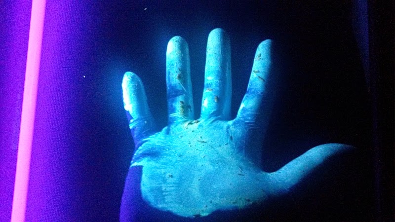 And more recently this method was used to detect exposure to these same chemicals from the BP Oil Spill in the Gulf of Mexico. In 2006 the City of Austin used black lights to detect coal tar sealers. I was surprised to see how easily it showed contaminated skin and lab surfaces.
