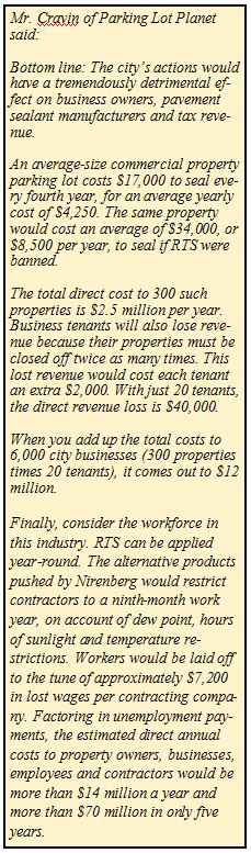The industry’s economic analysis contains false cost assumptions, false warranty assumptions, exaggerated seasonal effects, overstated economic value and ignores the environmental, legal and human costs as well as paving experts who recommend not using coal tar sealers.