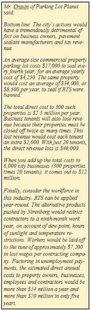 Using this number, the cost to clean up Mr. Cravin’s 300 coal tar sealed properties would be $150 million dollars. All for the privilege of making $15 million dollars in coal tar sealer sales. That doesn’t make sense and destines this product to the history books.