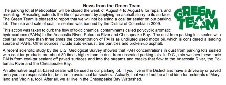 After the District of Columbia passed their ban of coal tar pavement sealers, the congregation of Metropolitan Memorial United Methodist Church resealed their parking lot. They took their choice of a non-toxic alternative to educate their congregation about the choices they were making and why a ban was taken up by the local government. They were informed and proactive…a model for others.